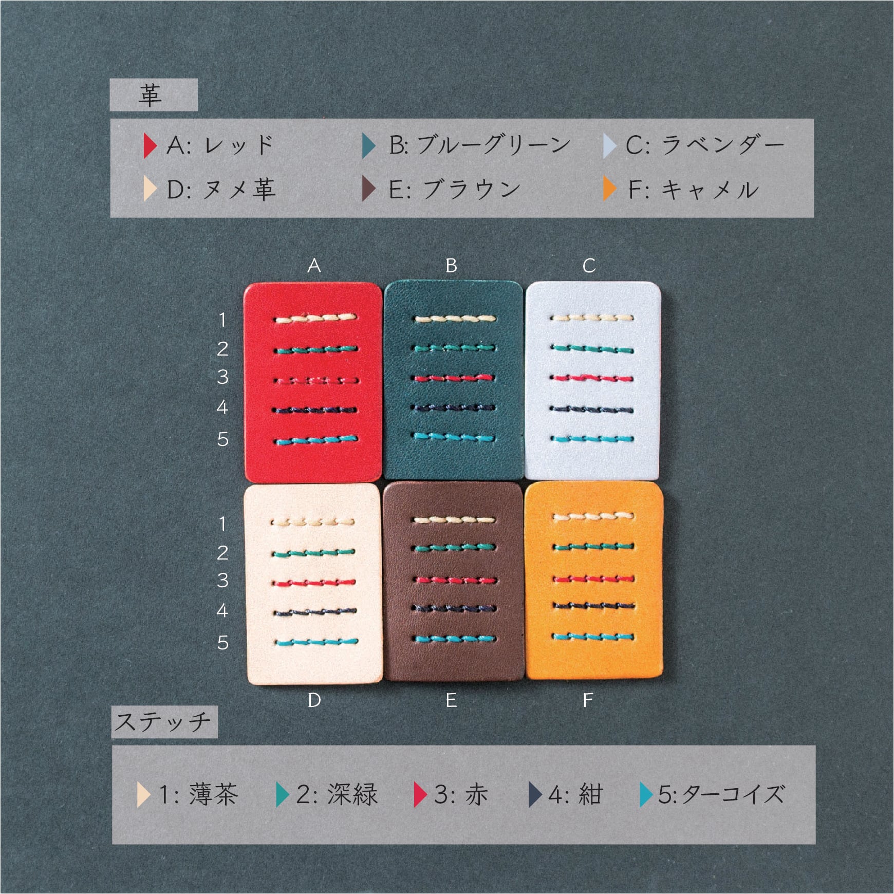 カラーシートで①革と②ステッチのカラーを参考にしていただき、